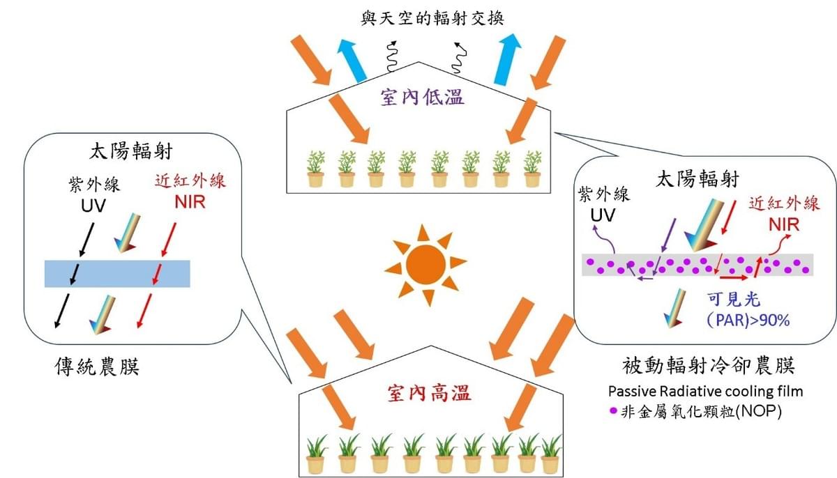 薄膜內建的微奈米顆粒氧化物混和均勻後,製成農膜,能將8-13微米波長的紅外線熱輻射可反射到大氣層直接散逸至太空,溫室內的升溫效應會大幅降低,並減少土壤水分蒸散。